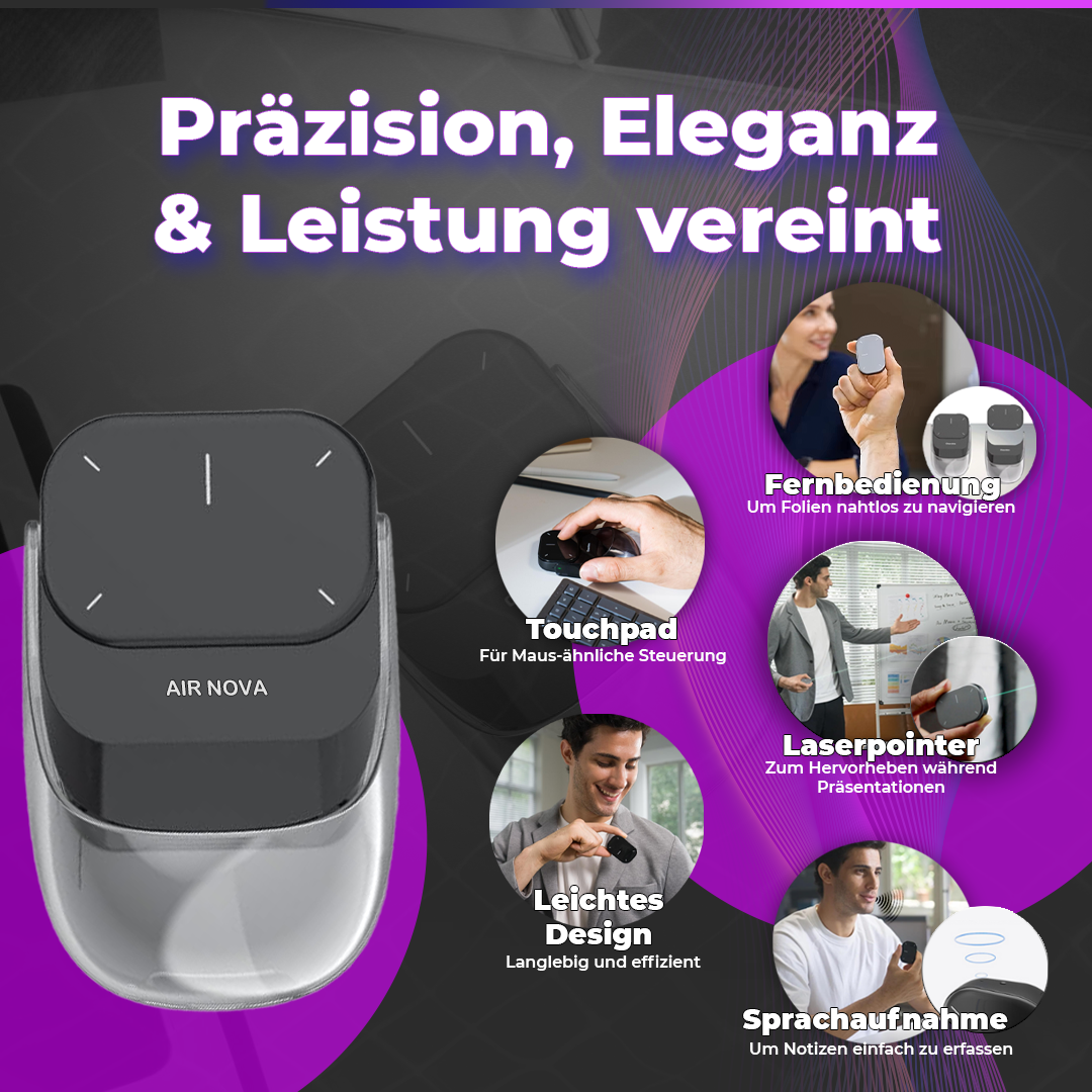 Ausgestattet mit einem leistungsstarken Laserpointer ist die Air Nova Ihr ultimativer Präsentationsbegleiter. Wechseln Sie nahtlos zwischen der Steuerung von Folien und dem Hervorheben wichtiger Punkte während Meetings, um jedes Mal eine professionelle und fesselnde Präsentation zu gewährleisten.